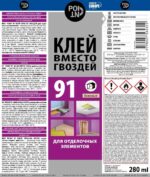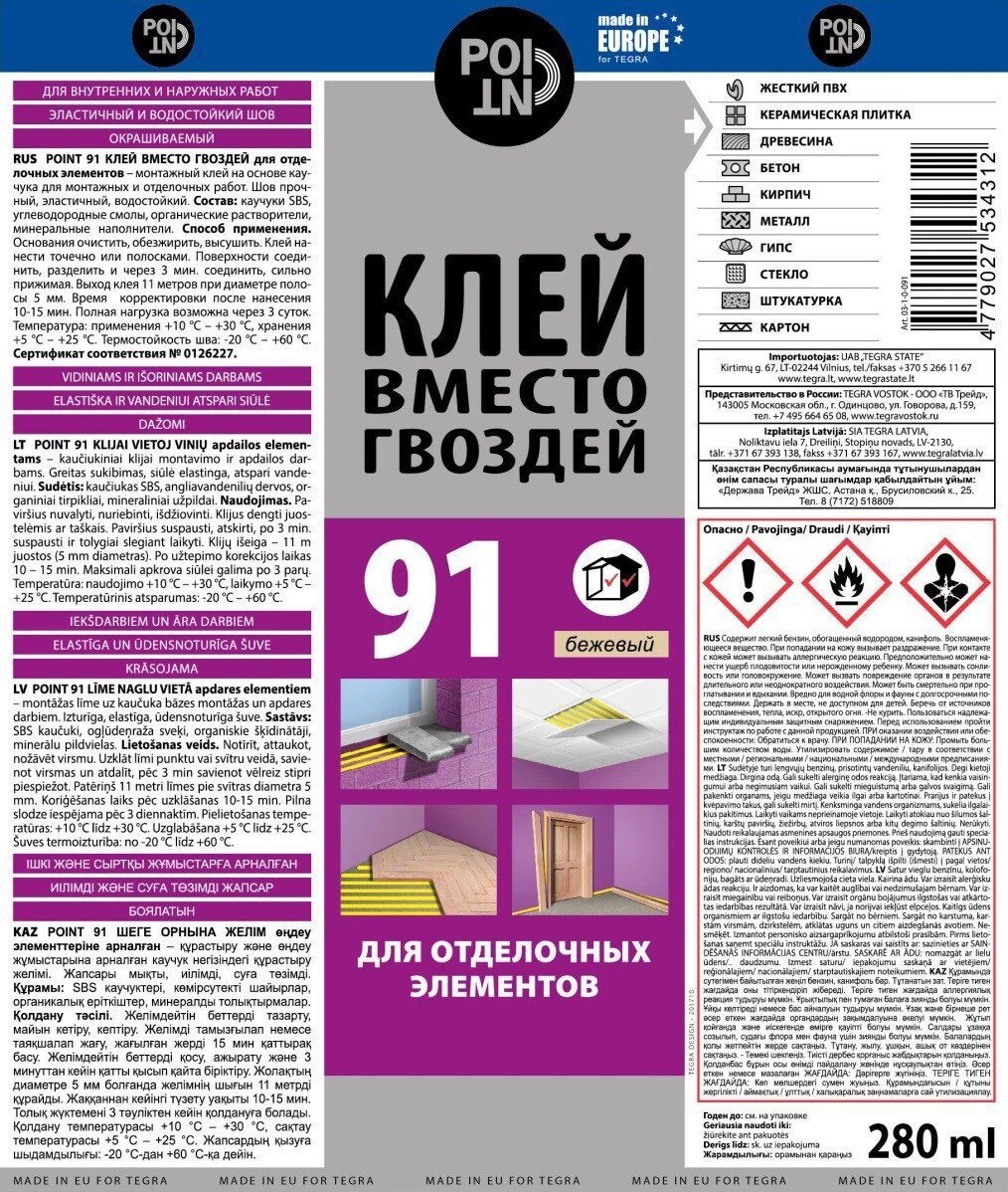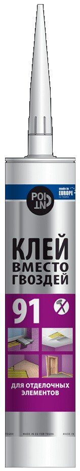 Клей монтажный POINT Клей вместо гвоздей 91 280 мл (03-1-0-091) – однокомпонентный, на основе растворителей на базе бутадиен-стиролового каучука (SBS). Клей характеризуется очень быстрым начальным связыванием, отличной адгезией и прочностью соединений. Рабочее время составляет 10-15 минут.