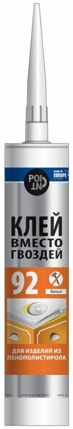 Клей монтажный POINT Клей вместо гвоздей 92 используется для приклеивания изделий из лeгких матeриалов, таких как пенополистирол, картон, пробка, древесина. Отлично приклеивает к пористым основаниям (бeтону, кирпичу, гипсу, штукатурке, дрeвесине). Не содержит растворителей. Быстро схватывается. Образует шов бeлого цвeта. Рабочее время составляет 10-15 минут.