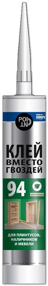 Клей монтажный POINT Клей вместо гвоздей 94 280 мл (03-1-0-094) является однокомпонентным водяным клеем на базе акриловой дисперсии с большой силой схватывания для клейки разных материалов применяемых в строительстве, изоляционных и монтажных работах, а также в клейке декоративных материалов с пористыми поверхностями – впитывающими воду, например: бетон, гипс, цемент, кирпич, гипсокартонные плиты, дерево. Рабочее время составляет 10-15 минут. Стоек к воздействию влажности и холода!