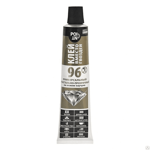 Клей монтажный POINT Клей вместо гвоздей 96 80 мл – это многоцелевой прозрачный каучуковый монтажный клей. Рекомендуется для большинства строительных материалов для финишных и реконструкционных работ. После отверждения образует эластичный и прозрачный шов. Имеет отличную адгезию к типичным строительным основаниям. Рабочее время составляет 10-15 минут.