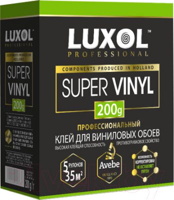 Клей обойный LUXOL SUPER VINIL Professional 200 г. предназначен для наклеивания виниловых обоев внутри жилых, административных, общественных и производственных помещений на бетонные, гипсокартонные, оштукатуренные и другие поверхности с аналогичной основой, а также для предварительной обработки поверхности под оклейку.