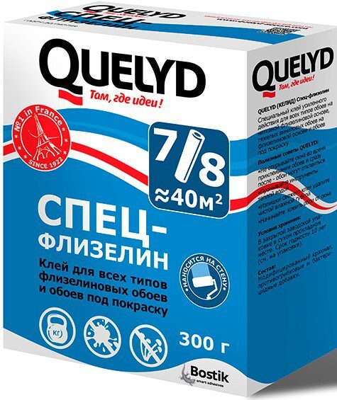 Клей обойный QUELYD Спец-флизелин 0,3 кг (Fliz 30080941) – специальный клей для любых обоев на нетканой флизелиновой основе, тяжёлых виниловых обоев на флизелиновой основе, в том числе и для флизелиновых обоев под покраску. Преимущества: усиленная формула; легкое нанесение клея позволяет быстро состыковать полотна; незаменим при наклейки обоев со сложным рисунком; экономит время: клей наносится прямо на стену, не нужно ждать, когда пропитаются обои; при окрашивании обоев не вступает в реакцию с краской; легкое снятие обоев по истечении их срока службы, так как клей не оставляет следов; защищает от образования грибка, так как содержит в своем составе противогрибковые и бактерицидные добавки; безопасен для здоровья и окружающей среды.Способ применения: Наклеивание обоев на флизелиновой основе осуществляется непосредственно на стену, следуя отмеченной линии. Поверхность стен должна быть чистой, сухой, прочной, с нормальной впитывающей способностью и без капиллярной влаги. Не следует разрезать рулон на полотна. Удалить пузырьки воздуха можно щеткой, разглаживая обои сверху вниз и от центра к краям.Не рекомендуется использовать для обоев на бумажной основе.