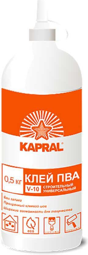 Клей строительный ПВА KAPRAL V10 0,5 кг предназначен для склеивания бумаги, картона, фанеры, кожи, ткани, а также древесины. При добавлении к меловым и гипсовым растворам улучшает пластичность раствора при нанесении, способствует увеличению прочности и эластичности высохшего модифицированного материала, повышает его адгезию к основанию. Не обладает запахом, образует бесцветный клеевой шов. Не рекомендуется для склеивания мебели.