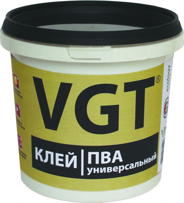 Клей ПВА универсальный VGT 1 кг предназначен для бытовых работ по склейке бумаги, картона, в качестве добавки в цементные растворы при работе с керамической плиткой. Клей представляет собой молочно-белую гомогенную, вязкую массу со слабым запахом. После высыхания образует эластичную плёнку. Клей наносится сплошным слоем или точечно при помощи кисти, валика или тампона. Ориентировочный расход клея при сплошном нанесении 80-200 г/м². Рабочая поверхность должна быть сухой и не иметь загрязнений.Рабочая поверхность должна быть сухой и не иметь загрязнений. При склеивании бумаги или картона изделием можно пользоваться через час. При склеивании виниловых обоев и других аналогичных материалов клей высыхает при нормальной влажности и комнатной температуре за 6-12 часов. У столярных изделий время сушки составляет 24-48 часов.