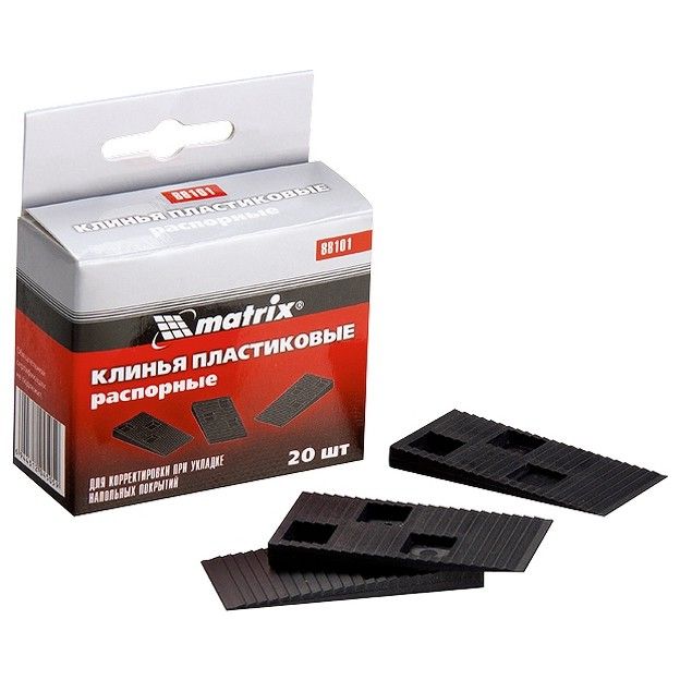 Пластиковые распорные клинья Matrix 88101, 20 штук в упаковке, предназначены для корректировки напольных покрытий при их укладке. Они позволяют создать ровный зазор между ламинатом и стеной для предотвращения его деформации в процессе эксплуатации. Клинья также обеспечивают надежную фиксацию ламината, не допуская его сдвига во время монтажа.