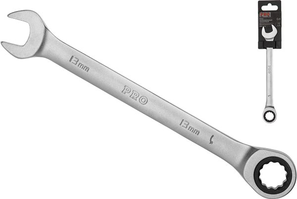 Ключ комбинированный 13 мм с трещоткой PRO STARTUL (PRO-7013) предназначен для эффективного откручивания или закручивания болтовых соединений. Изготовлен из хромванадиевой стали. 12 гранный профиль накидной части. Трещеточный механизм – 72 зуба. Покрытие – сатинированный хром.