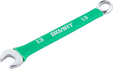 Ключ комбинированный в прорезиненной оплетке ВОЛАТ изготовлен из высокопрочной стали и имеет окончание в виде рожкового ключа размером 13 мм с одной стороны и окончание в виде накидного ключа размером 13 мм с другой стороны.