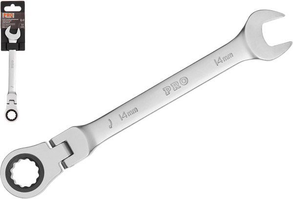 Ключ комбинированный 14 мм с поворотной трещоткой PRO STARTUL (PRO-7214) предназначен для эффективного откручивания или закручивания болтовых соединений. Профиль накидной части: 12 граней. Шарнирное соединение накидной части позволяет работать ключом в труднодоступных местах. Трещоточный механизм = 72 зуба, минимальный угол возврата ключа – 5°. Материал изготовления: хромованадиевая сталь, покрытие: хромоникелевое антикоррозионное.