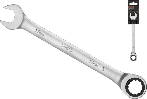 Ключ комбинированный 17 мм с трещоткой PRO STARTUL (PRO-7017) предназначен для эффективного откручивания или закручивания болтовых соединений. Изготовлен из хромванадиевой стали. 12 гранный профиль накидной части. Трещеточный механизм – 72 зуба. Покрытие – сатинированный хром.