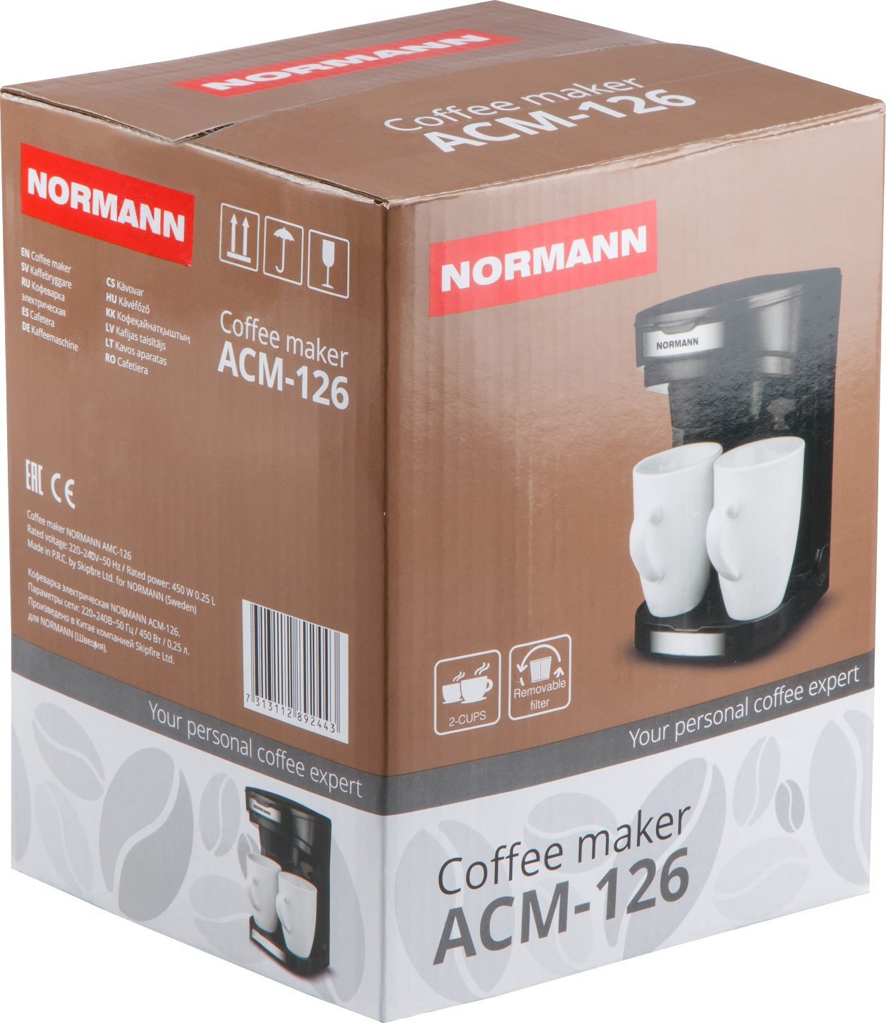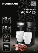 Кофеварка NORMANN ACM-126 – капельного типа c электронной схемой управления режимами. Поможет сварить вкусный и бодрящий кофе. Прибор имеет защиту от перегрева. Емкость резервуара – 250 мл, что достаточно на 2 кружки кофе. В комплект поставки входят 2 кружки.