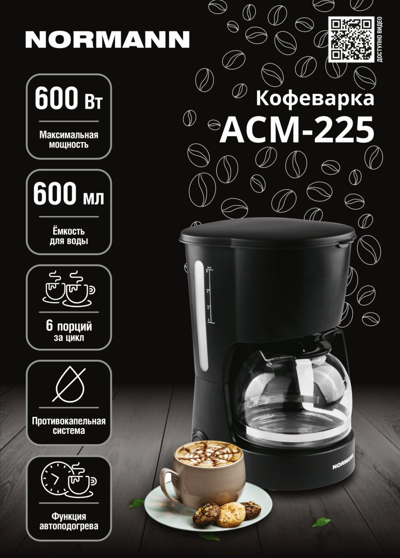 Кофеварка NORMANN ACM-225 капельного типа сочетает в себе качество, надежность, простоту в использовании и обслуживании. Имеет удобную электронную схему управления режимами. Для более комфортного использования емкость для воды оснащена мерными делениями. В комплект входит колба на 6 порций кофе, съемный нейлоновый фильтр многоразового использования, мерная ложка, руководство по эксплуатации. Можно использовать одноразовые бумажные фильтры (приобретаются отдельно, рекомендуется размер №2).