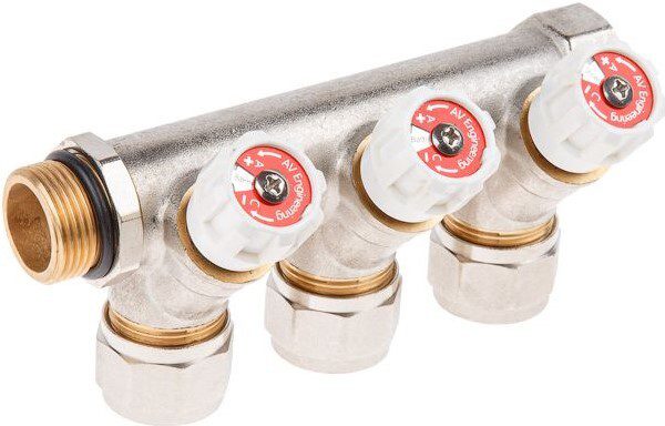 Главная Сантехника Трубы, Фитинги, Уплотнители Коллекторы Коллектор с отсекающими вентилями, 3/4″ х 3 вых. (16 х 2.0), AV Engineering