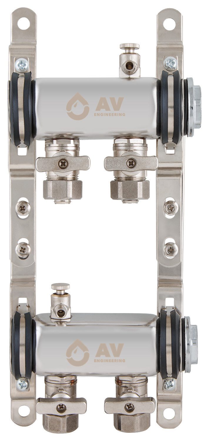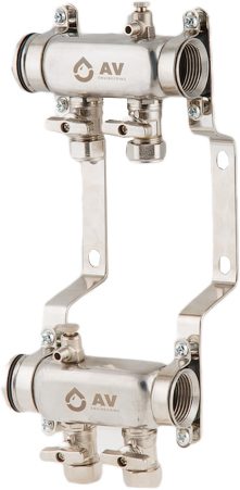 Коллекторная группа AVE134, 2 выхода AV Engineering (AVE13400102) предназначена для распределения и регулировки систем теплого пола. Материал изготовления коллектора – нержавеющая сталь. Гарантия на комплектующие – 1 год. Подключение 1″.