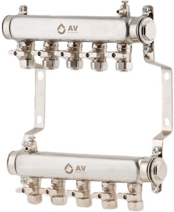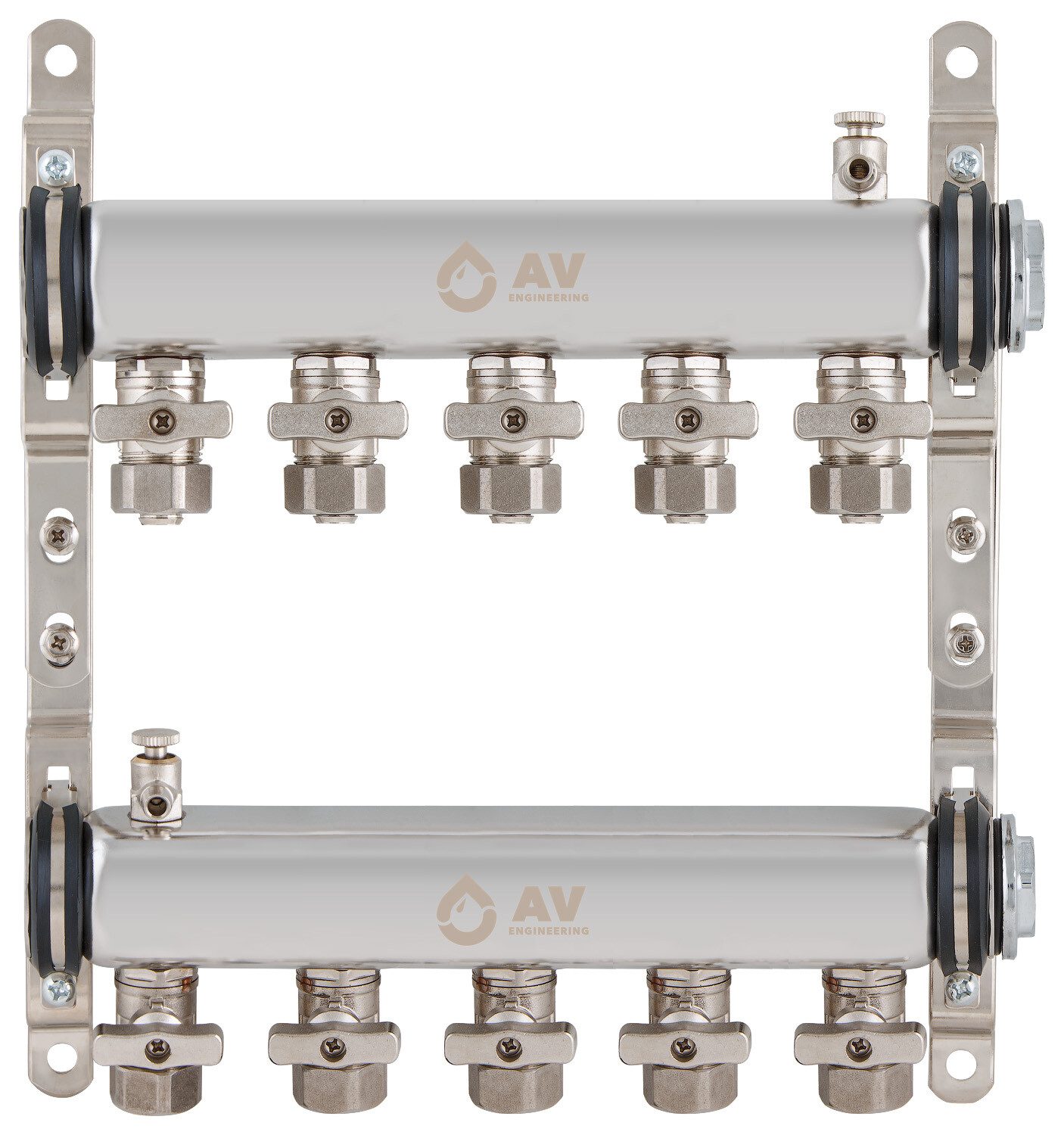 Коллекторная группа AVE134, 5 выходов AV Engineering (AVE13400105) предназначена для распределения и регулировки систем теплого пола. Материал изготовления коллектора – нержавеющая сталь. Гарантия на комплектующие – 1 год.