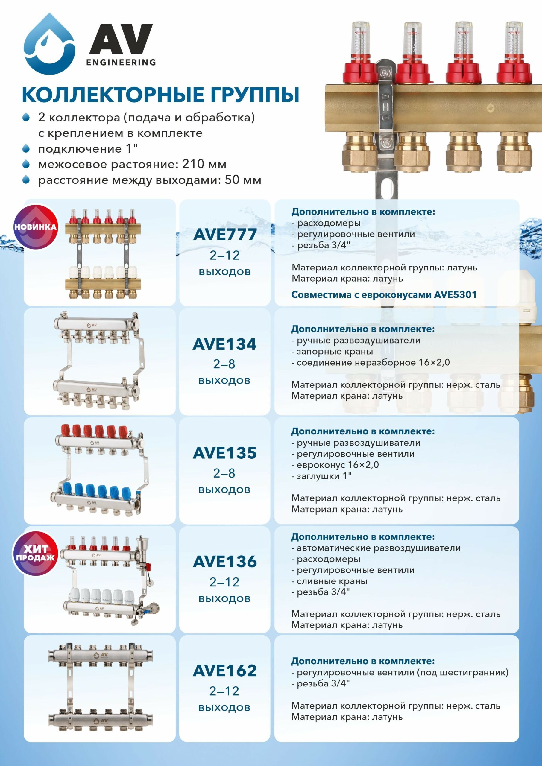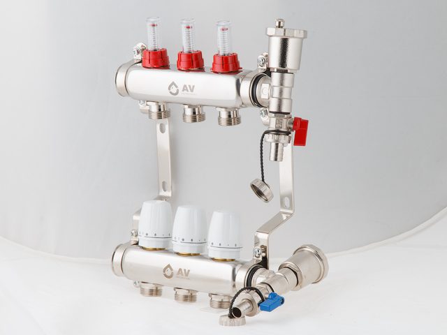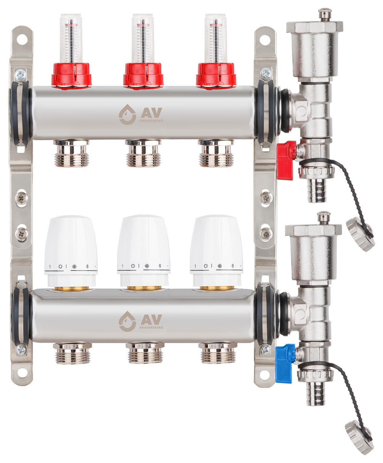 Коллекторная группа AVE136K 3 выхода AV ENGINEERING (AVE13600103K) предназначена для распределения и регулировки систем теплого пола и водоснабжения.