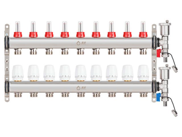 Коллекторная группа AVE136, 9 выходов AV ENGINEERING (AVE13600109) предназначена для распределения и регулировки систем теплого пола. Материал изготовления коллектора – нержавеющая сталь. В комплект поставки входит: 2 коллектора (подача и обратка), крепление коллектора, автоматические развоздушиватели, расходомеры, регулировочные вентили, сливные краны, резьба 3/4″. Гарантия на комплектующие – 1 год.