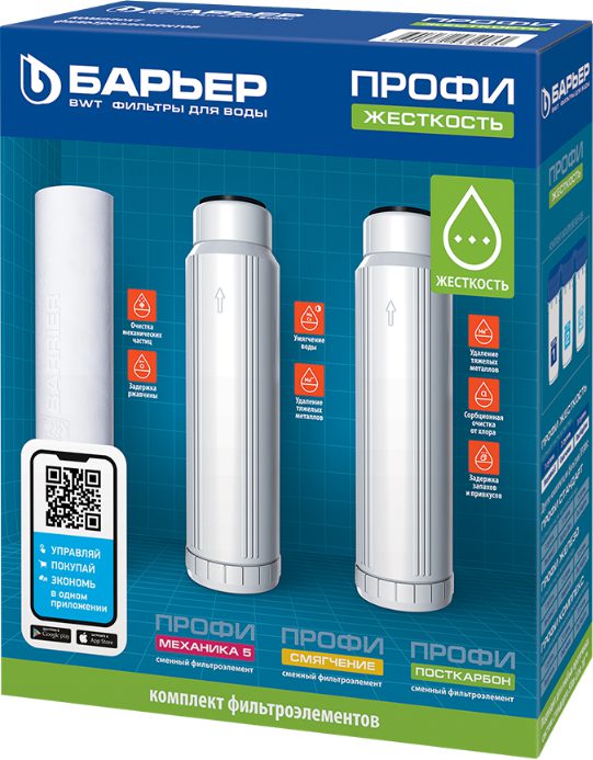 Комплект картриджей БАРЬЕР Профи Hard обеспечивает комплексную очистку жесткой воды. Может использоваться в системах холодного водоснабжения в квартирах, загородных домах, на дачах и т. д. Три кассеты обеспечивают максимально эффективное очищение проточной воды от механических загрязнений и примесей, ила, песка, ржавчины, окалины (“Профи Механика”), от солей жесткости (“Профи Смягчение”), от соединений тяжелых металлов (“Профи ПостКарбон”). При этом вода смягчается, нормализуется баланс солей жесткости в ее составе, а также происходит кондиционирование воды, то есть устранение неприятного привкуса и посторонних запахов.