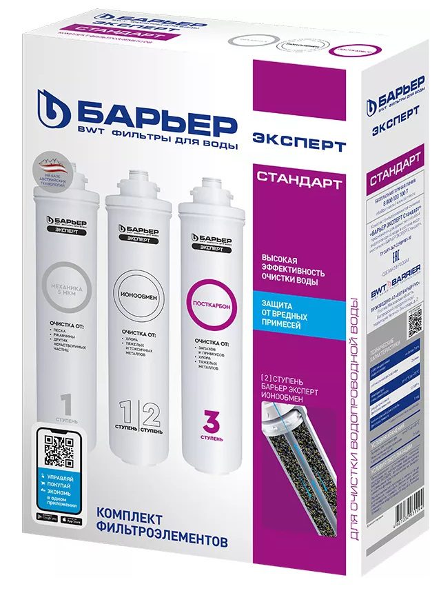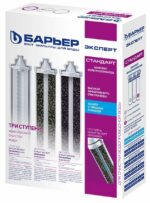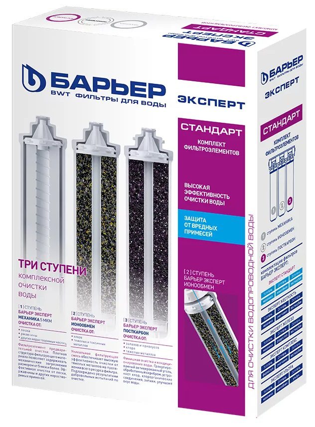 Комплект картриджей БАРЬЕР Эксперт Стандарт для проточного фильтра под мойку нового поколения Expert Standard. Надежная защита от крупных механических частиц, активного хлора, ионов тяжелых и токсических металлов. Финальная ступень устраняет неприятные запахи и привкусы воды.EXPERT Механика – предварительный фильтр. Очистка от механических загрязнений с тонкостью фильтрации 5 мкм: песка, взвесей, ржавчины, окалины и т.д.EXPERT Ионообмен – уникальная фильтрующая смесь обеспечивает высокую эффективность очистки от тяжелых металлов на протяжении всего ресурса фильтра.EXPERT ПостКарбон – финишная очистка. Гранулированный активированный уголь, обработанный серебром, устраняет хлор, хлорорганические соединения, неприятные запахи, улучшает вкус воды.