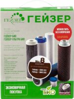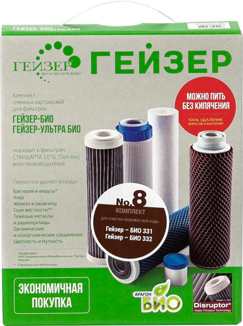 Комплект картриджей ГЕЙЗЕР №8 – сменный модуль для стационарных систем очистки питьевой воды. Применяется в системах: Гейзер БИО 331, Гейзер БИО 332. Картридж Арагон-БИО содержит особо эффективную биоцидную добавку, которая во взаимодействии с материалом Арагон и при сохранении в картридже серебра в несмываемой форме, создает тройную гарантию защиты от вирусов и бактерий. В картридже Арагон-БИО применена технология монодисперсного распределения пор полимера, что увеличивает гарантии задержания любых загрязнений во всем объеме картриджа и сохранение высоких характеристик очистки на всем протяжении ресурса. Картридж БС предназначен для удаления из воды избыточных солей жесткости на ионообменной смоле пищевого класса. Способность к удалению солей жесткости ионообменной смолы восстанавливается после простой регенерации раствором поваренной соли. Используется в фильтрах Гейзер для очистки жесткой и очень жесткой воды. Картридж ММВ используется в фильтрах Гейзер комплектации Элита. Этот картридж изготовлен из углеродного волокна с большой поверхностью поглощения. Для жесткой воды.