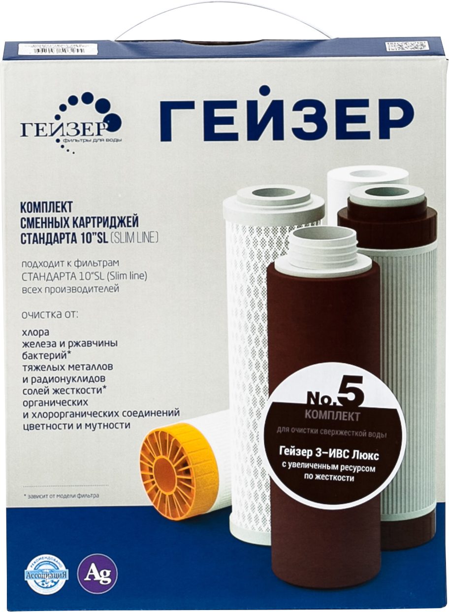 Комплект картриджей ГЕЙЗЕР №5 для сверхжесткой воды. Композитный материал Арагон 2 (первая ступень), синтезирован по разработанной компанией Гейзер уникальной технологии добавки ионообменной смолы. Примерное соотношение полимера Арагон к ионообменной смоле составляет 1:1. Это и позволило увеличить ресурс по удалению солей жесткости картриджем Арагон 2 в 12-15 раз по сравнению с Арагоном Ж. Умягчающий картридж БС (вторая ступень) Предназначен для установки в фильтры с отдельным краном.Применяется для фильтрации жесткой и очень жесткой воды. Удаляет из воды с помощью ионообменной смолы пищевого класса избыточные ионы Кальция и Магния. Картридж СВС (третья ступень очистки) изготовлен из кокосового активированного угля, созданного по технологии карбон блок (СВС). Имеет большую сорбционную способность, чем гранулированный уголь. Картридж хорошо очищает воду от хлора, улучшает вкус, цвет и запах воды. Картридж СВС прошел сертификацию NSF – на соответствие самым жестким международным требованиям по качеству.