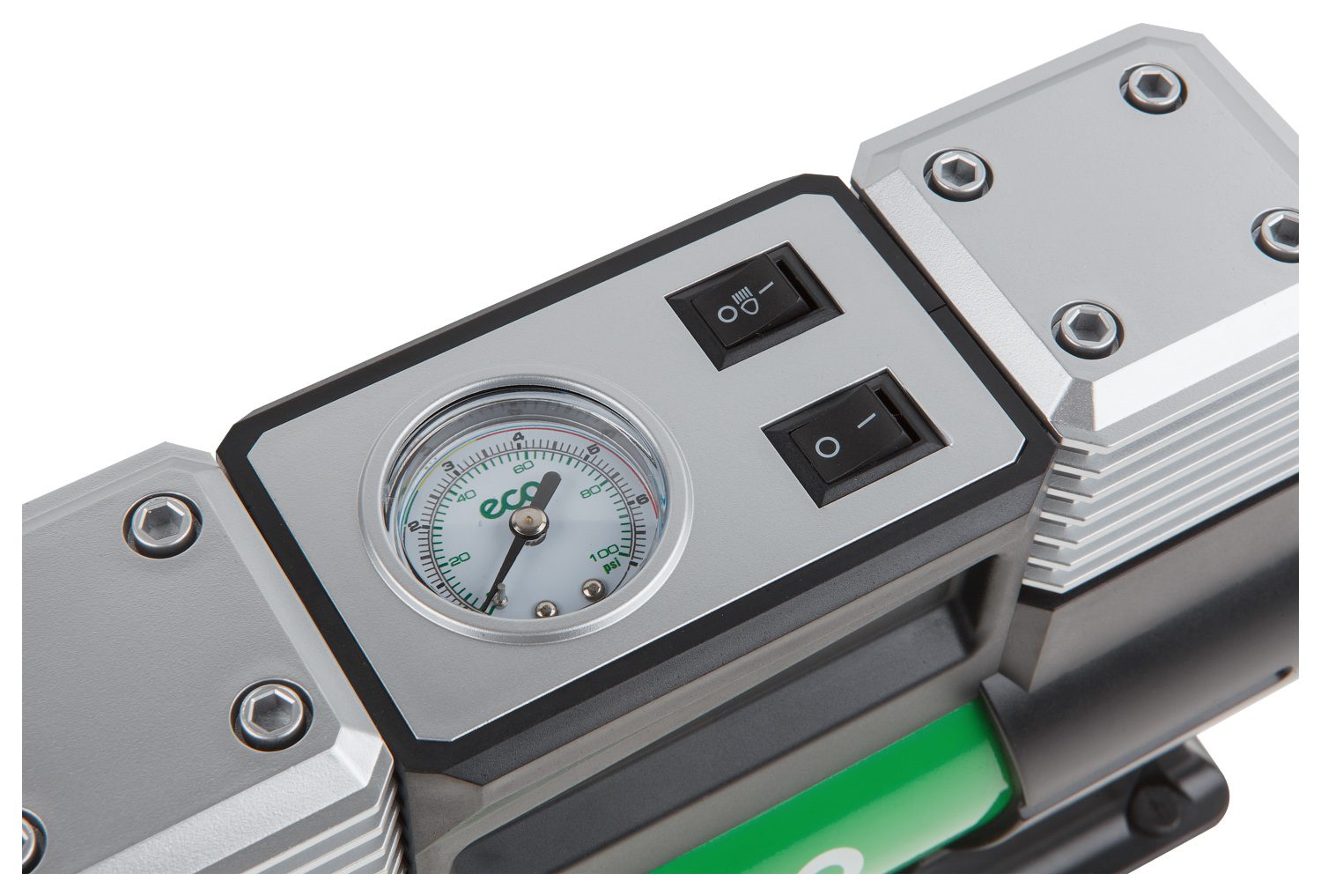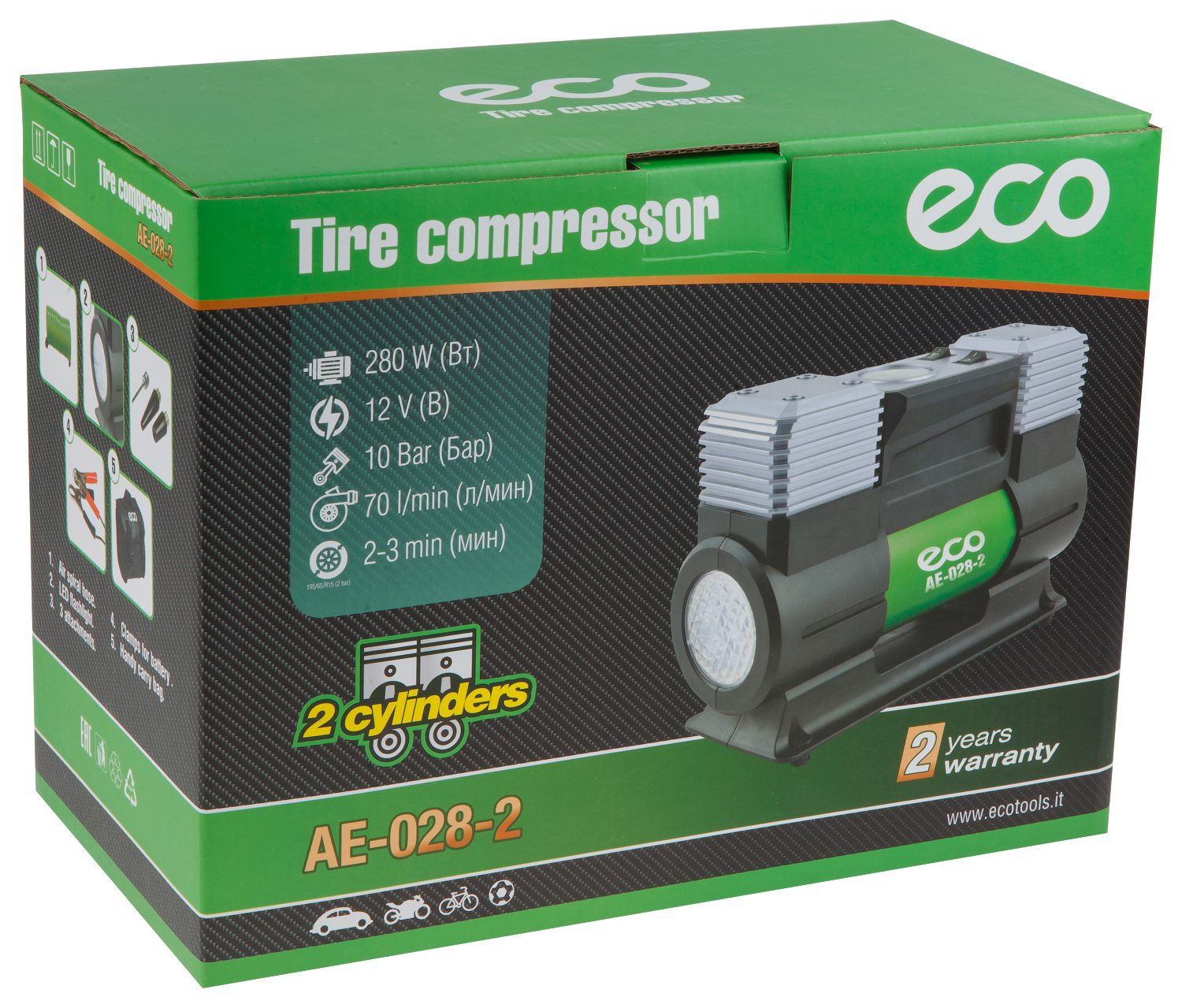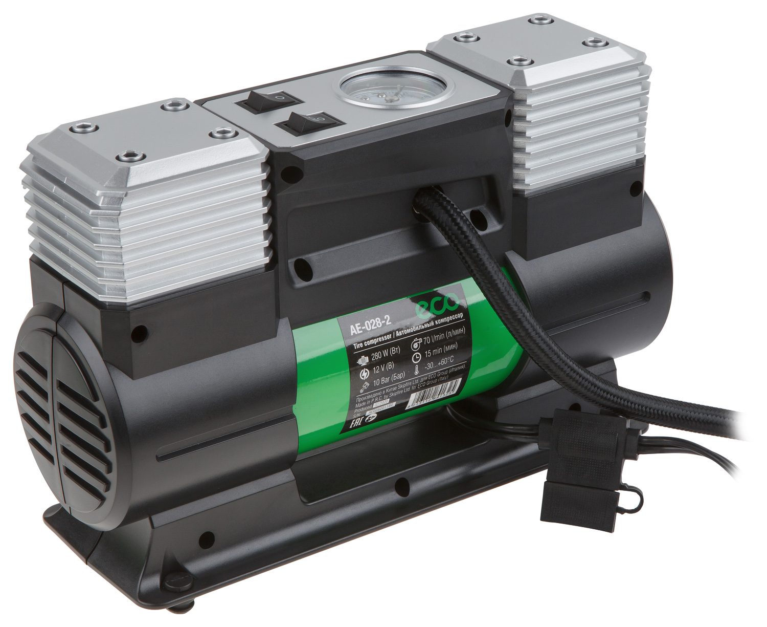Компрессор автомобильный ECO AE-028-2 – двухцилиндровый производительный насос. Мощный двигатель со 100% медной обмоткой и большим статором обеспечивает гарантированно высокий ресурс устройства и быстроту работы. Тефлоновый поршень с подшипником. Высококачественный шланг в защитной оплетке. Время накачивания колеса 195/65/R15 до давления 2 бар – 2-3 мин. Большой манометр градуирован до 7 бар. Встроенный светодиодный фонарь удобен при эксплуатации в темное время суток. Резьбовой коннектор с антикороззийным напылением. В комплекте спиральный шланг 3 метра, увеличивающий радиус действия компрессора. Удобная сумка для хранения и транспортировки. Антивибрационные резиновые ножки.