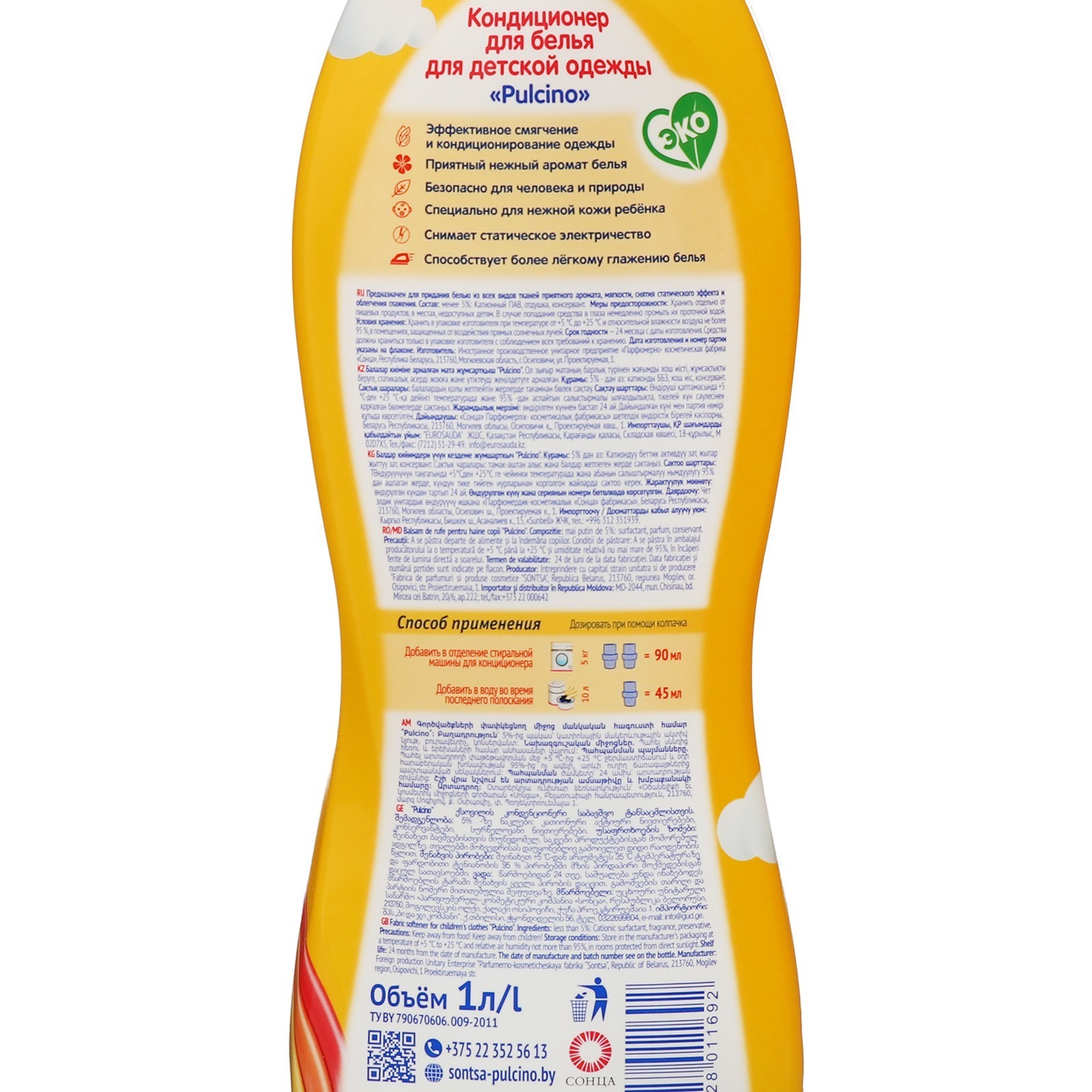 Способ применения: кондиционер добавить в отделение стиральной машины для кондиционера 90 мл средства из расчета на 5 кг белья; при ручной стирке добавить в воду во время последнего полоскания из расчета 45 мл средства на 10 л воды