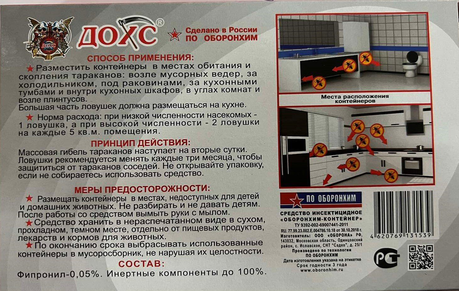 Контейнер от тараканов 6 штук ОБОРОНХИМ ДОХС предназначен для уничтожения всех видов тараканов на объектах с повышенными требованиями к гигиене (жилых помещениях, детсадах, яслях, предприятиях общепита, объектах ветеринарии и содержания животных). Представляет собой небольшой пластиковый контейнер с приманкой внутри, недоступной для детей и домашних животных. Уничтожает насекомых за 24 часа на площади 100 кв. м.