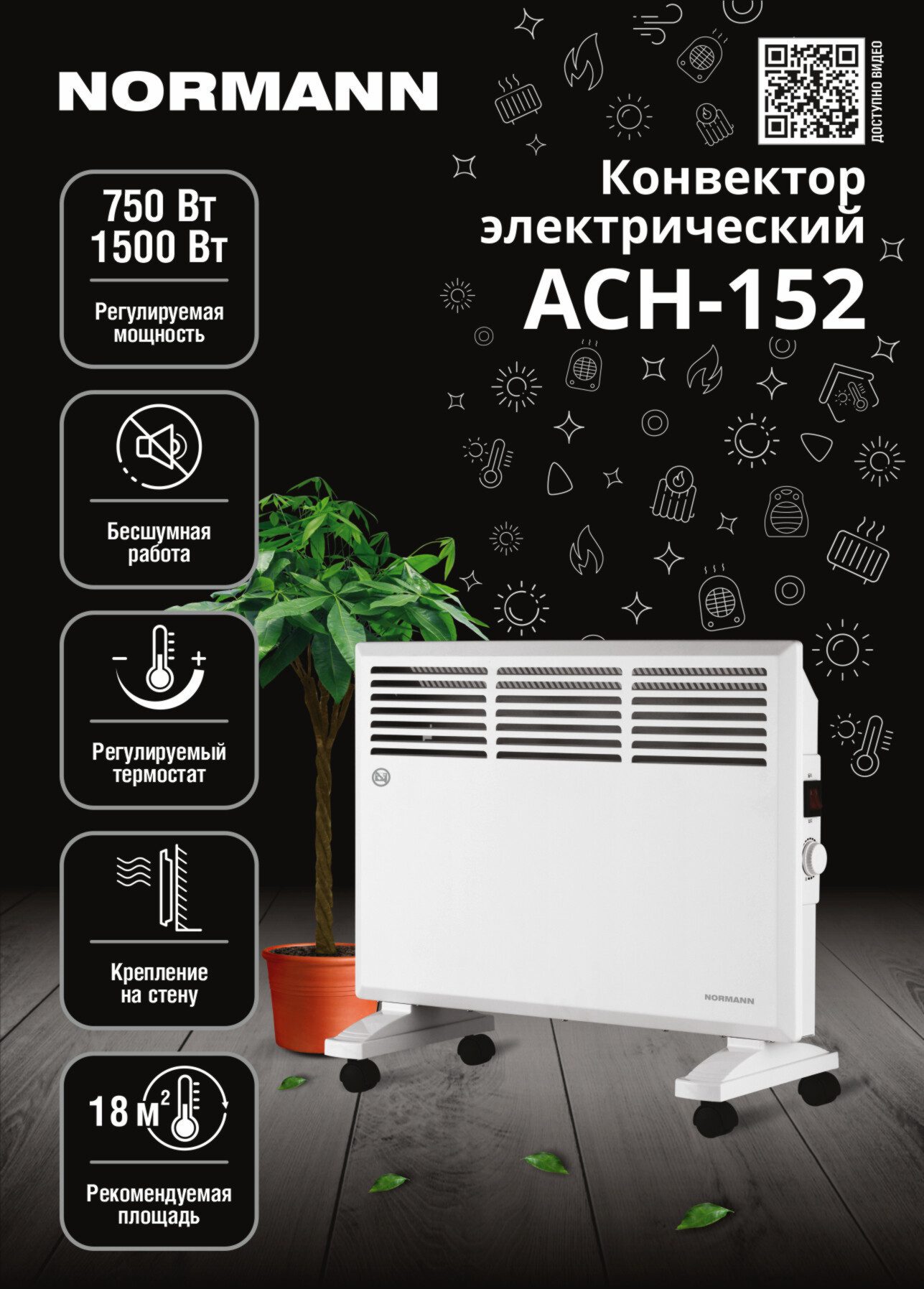 Конвектор NORMANN ACH-152 служит для обогрева помещений площадью до 18 м2. Тихая работа. У прибора нет вентилятора, поэтому он не гудит. Модель снабжена колёсиками для передвижения по полу и кронштейном для крепления к стене. Ручка термостата позволит постоянно поддерживать в комнате комфортную температуру. Двухрежимный выключатель ‒ режим экспресс-нагрева и экономичный режим. Прибор оснащен защитой от опрокидывания и перегрева. Длина электрического провода: 1,3 м. Степень защиты: IPX0.