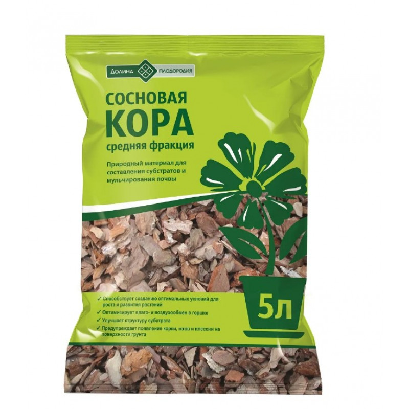 Кора cосновая ДОЛИНА ПЛОДОРОДИЯ 5 л способствует созданию оптимальных условий для роста и развития растений. Оптимизирует влаго- и воздухообмен в горшке. Улучшает структуру субстрата. Предупреждает появление корки, мхов и плесени на поверхности грунта.