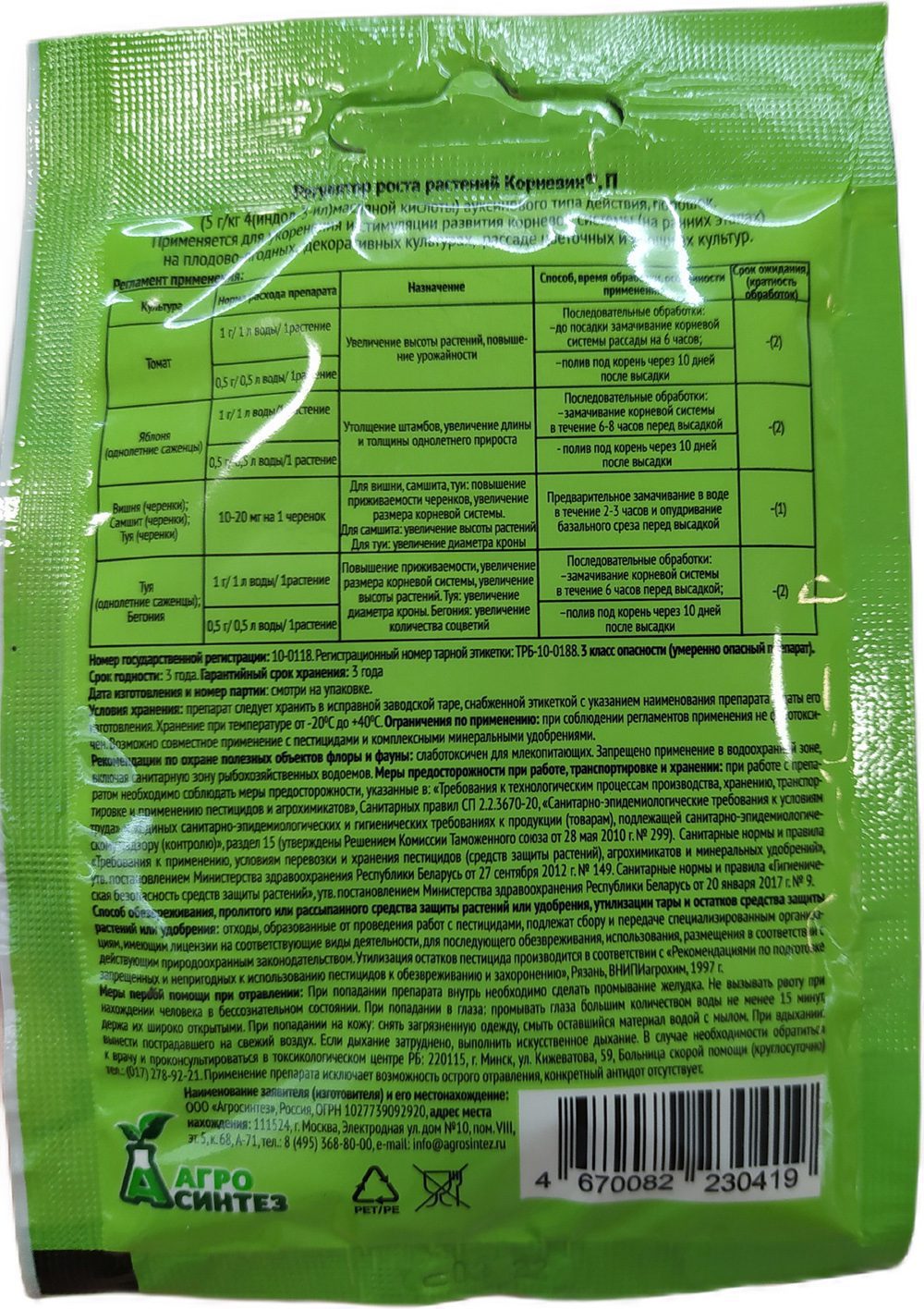 Регулятор роста АГРОСИНТЕЗ Корневин П 10 г (БП-00003296) относится к регуляторам роста растений ауксинового типа. Стимулирует образование боковых корней, ускоряет разрастание корневой системы и формирование адвентивных (придаточных) корней на побегах/черенках. Применяется для укоренения и приживаемости рассады и саженцев широкого спектра культурных растений (плодово-ягодные, декоративные, овощные, лиственные и хвойные древесные культуры). Способствует быстрой приживаемости посадочного материала и снижению стресса при посадке и пересадке саженцев, сеянцев, рассады овощных и цветочных культур.