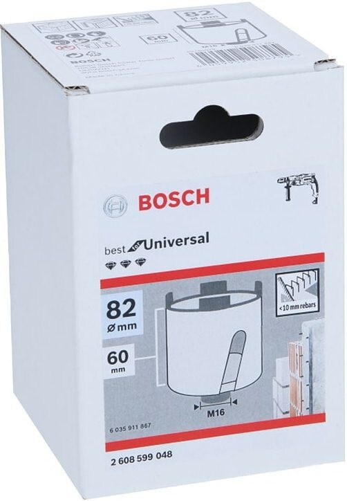 Коронка алмазная 82 мм BOSCH Best for Universal (2608599048) полая коронка для подрозетников Best for Universal — оптимальный выбор для сухого сверления мягких и твердых строительных материалов. Благодаря улучшенной структуре сегментов коронка обеспечивает высокоэффективное сухое сверление даже при работе с самыми прочными материалами. Сегменты прочно закреплены при помощи лазерной сварки на теле коронки, изготовленном из закаленной стали. Такое крепление препятствует случайной поломке и гарантирует необычайно долгий срок службы даже при работе с самыми прочными материалами. Используйте с дрелями мощностью не менее 1 000 Вт, а также с ударными дрелями SDS plus в безударном режиме со скоростью сверления от 1 300 об/мин.