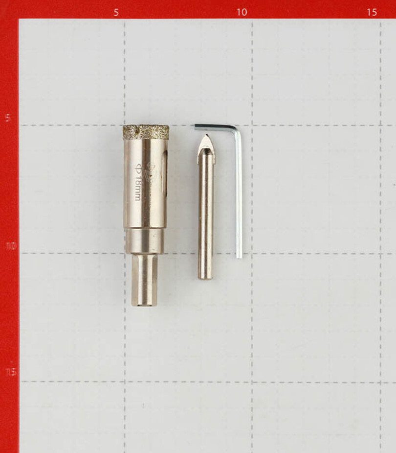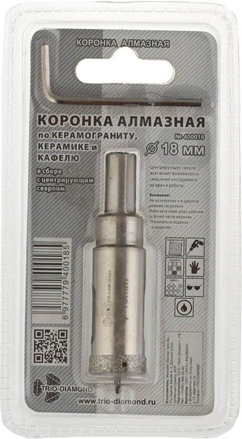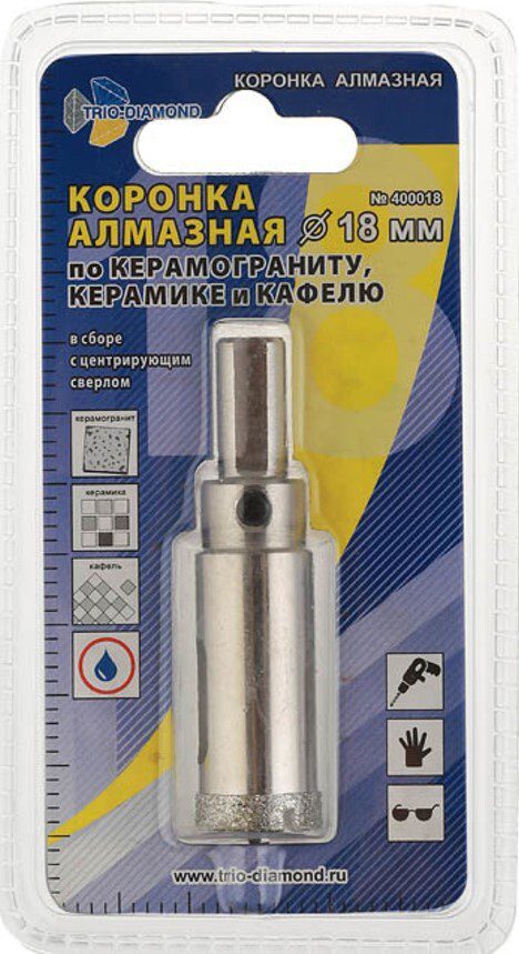 Коронка алмазная d 18 мм по керамике и кафелю TRIO-DIAMOND (400018) с центрирующим сверлом, предназначена для сверления керамогранита, керамики, кафеля и стекла. Оптимально подобранный размер и шаг алмазных сегментов позволил получить высокую скорость сверления, хороший подвод воды в зону реза, что увеличило ресурс коронок. При изготовлении коронок применяется гальванический метод нанесения алмазов. Этот метод позволяет получить плотность размещения алмазных зерен в 16 раз выше, чем метод спекания. Коронка используется для работы с водяным охлаждением в безударном режиме. Хвостовик цилиндрический c 3 гранями, несъёмный, под зажимной патрон.