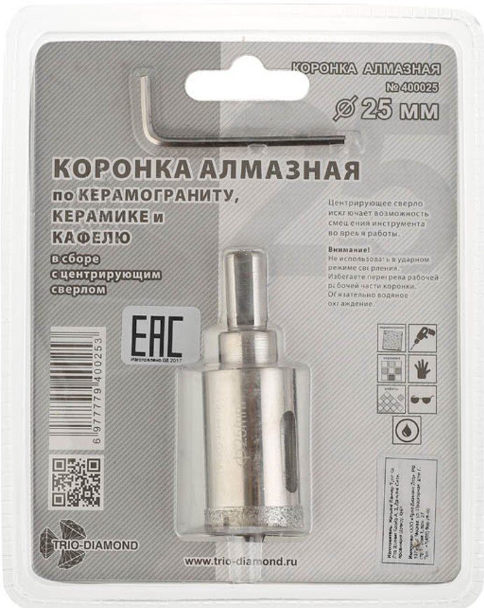 Коронка алмазная d 25 мм по керамике и кафелю TRIO-DIAMOND (400025) предназначена для сверления керамогранита, керамики и подобных материалов. Оптимально подобранный размер и шаг алмазных сегментов позволил получить высокую скорость сверления, хороший подвод воды в зону реза, что увеличило ресурс коронок. При изготовлении коронок применяется гальванический метод нанесения алмазов. Этот метод позволяет получить плотность размещения алмазных зерен в 16 раз выше, чем метод спекания. Хвостовик цилиндрический c 3 гранями.
