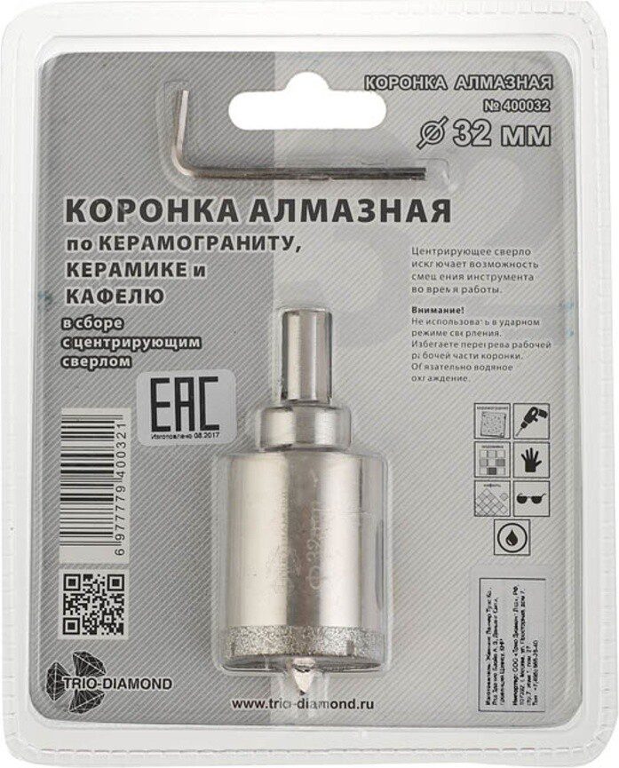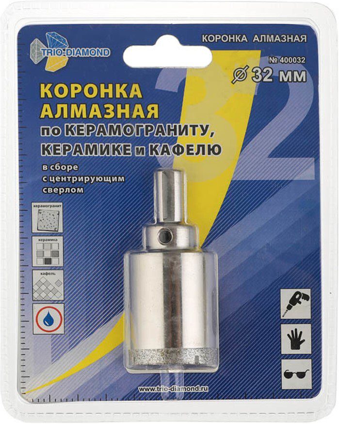 Коронка алмазная d 32 мм по керамике и кафелю TRIO-DIAMOND (400032) с центрирующим сверлом, предназначена для сверления керамогранита, керамики, кафеля и стекла. Оптимально подобранный размер и шаг алмазных сегментов позволил получить высокую скорость сверления, хороший подвод воды в зону реза, что увеличило ресурс коронок. При изготовлении коронок применяется гальванический метод нанесения алмазов. Этот метод позволяет получить плотность размещения алмазных зерен в 16 раз выше, чем метод спекания. Коронка используется для работы с водяным охлаждением в безударном режиме. Хвостовик цилиндрический c 3 гранями, несъёмный, под зажимной патрон.
