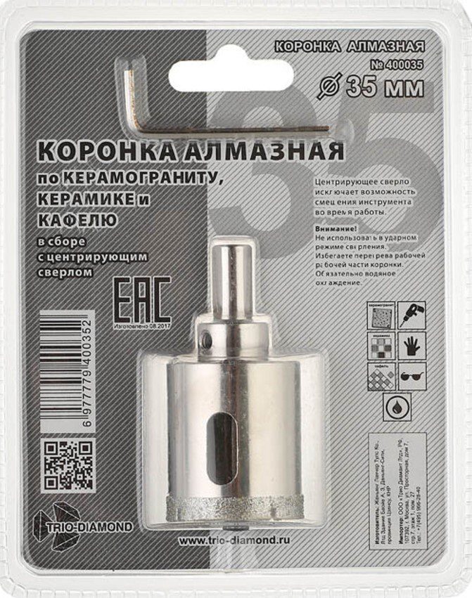 Коронка алмазная d 35 мм по керамике и кафелю TRIO-DIAMOND (400035) с центрирующим сверлом, предназначена для сверления керамогранита, керамики, кафеля и стекла. Оптимально подобранный размер и шаг алмазных сегментов позволил получить высокую скорость сверления, хороший подвод воды в зону реза, что увеличило ресурс коронок. При изготовлении коронок применяется гальванический метод нанесения алмазов. Этот метод позволяет получить плотность размещения алмазных зерен в 16 раз выше, чем метод спекания. Коронка используется для работы с водяным охлаждением в безударном режиме. Хвостовик цилиндрический c 3 гранями, несъёмный, под зажимной патрон.