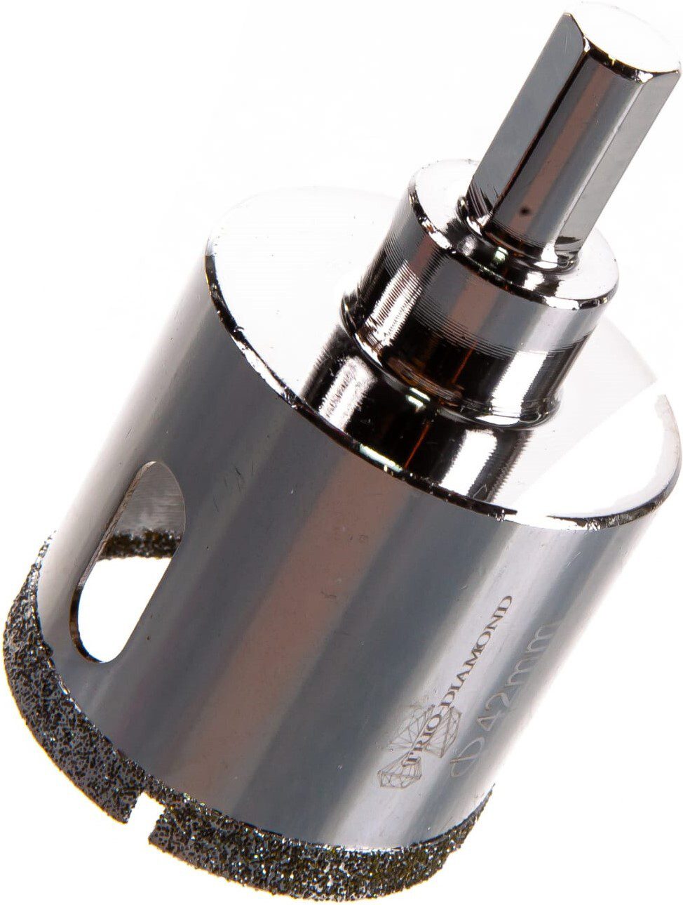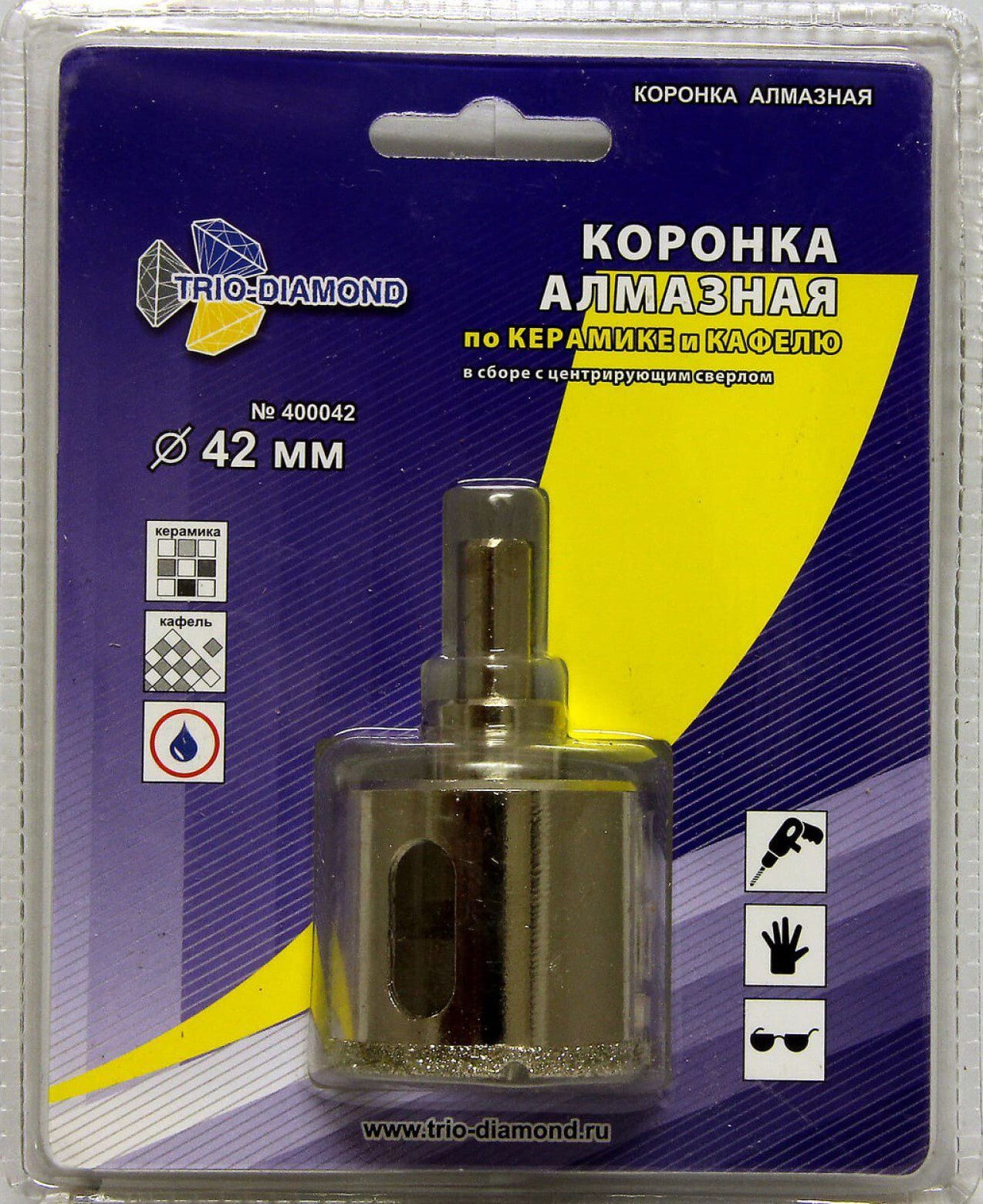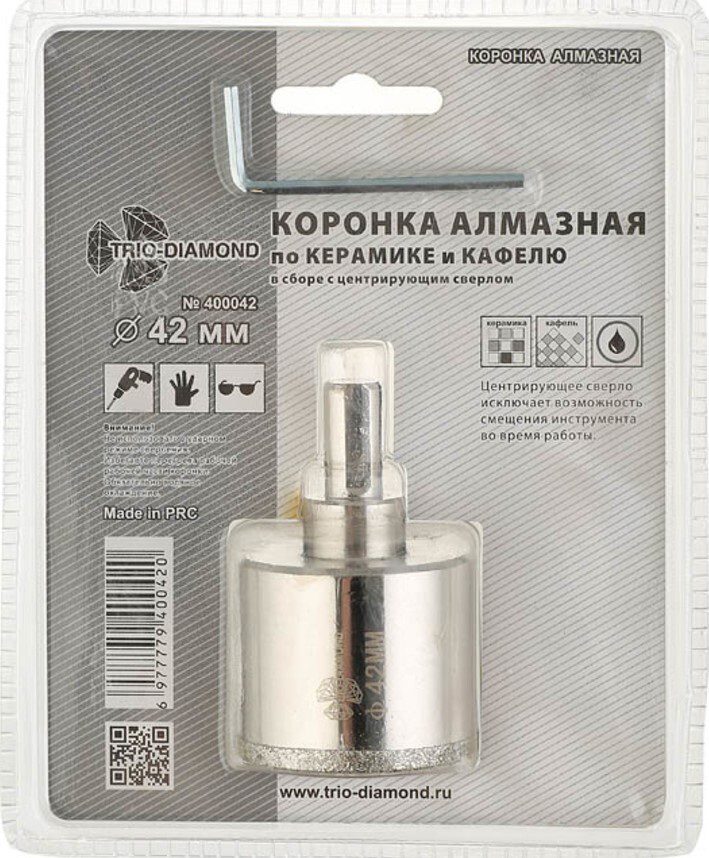 Коронка алмазная d 42 мм по керамике и кафелю TRIO-DIAMOND (400042) с центрирующим сверлом, предназначена для сверления керамогранита, керамики, кафеля и стекла. Оптимально подобранный размер и шаг алмазных сегментов позволил получить высокую скорость сверления, хороший подвод воды в зону реза, что увеличило ресурс коронок. При изготовлении коронок применяется гальванический метод нанесения алмазов. Этот метод позволяет получить плотность размещения алмазных зерен в 16 раз выше, чем метод спекания. Коронка используется для работы с водяным охлаждением в безударном режиме. Хвостовик цилиндрический c 3 гранями, несъёмный, под зажимной патрон.