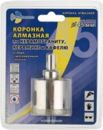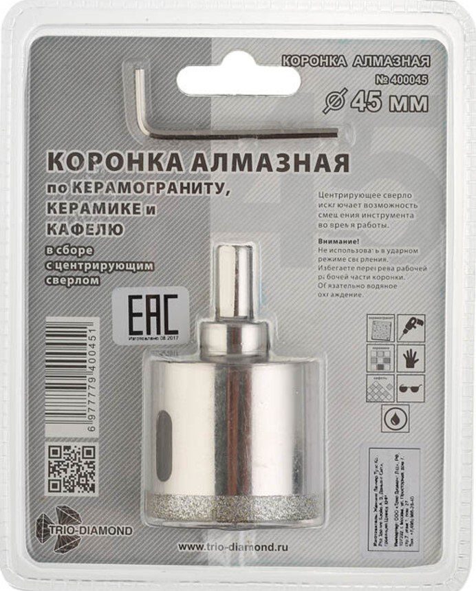 Коронка алмазная d 45 мм по керамике и кафелю TRIO-DIAMOND (400045) используется для сверления керамогранита, керамики, кафеля и стекла. Оптимально подобранный размер и шаг алмазных сегментов позволил получить высокую скорость сверления, хороший подвод воды в зону реза, что увеличило ресурс коронки. При изготовлении коронки применяется гальванический метод нанесения алмазов. Этот метод позволяет получить плотность размещения алмазных зерен в 16 раз выше, чем метод спекания. Хвостовик цилиндрический c 3 гранями, несъемный, под зажимной патрон. Глубина сверления 35 мм, высота сегмента 4,5 мм. Предназначена для работы с водяным охлажением в безударком режиме.