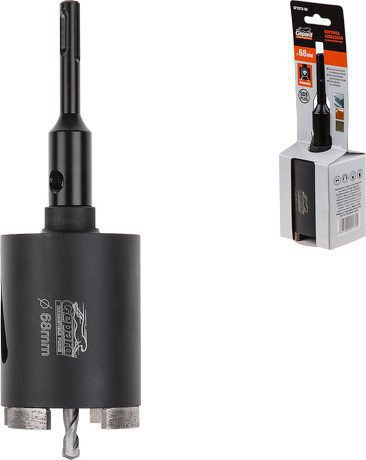 Коронка алмазная d 68 мм железобетон GEPARD (GP2078-68) используется в перфораторах с типом крепления SDS-plus для высверливания глухих подрозеточных отверстий и отверстий для распределительных монтажных коробок в стенах.Применение: стены из армированного бетона (железобетона), бетона, кирпича, гранита, природного и искусственного камня, газосиликатных блоков.Количество сегментов: 4.Тип сверления: сухое безударное, запрещается применять при запуске ударного режима.Комплект: коронка с алмазными сегментами, направляющее центрирующее сверло по бетону, держатель для коронки с хвостовиком SDS-plus, клин для выбивания центрирующего сверла из державки.Рекомендации по использованию: для облегчения работы и во избежание заклинивания коронки необходимо использовать легкие вращательные движения (перфоратором) во время работы, а также следует извлечь центрирующее сверло после прохождения первых 5 мм обрабатываемого материала. Возможность работы без подачи воды. Охлаждение водой увеличивает ресурс.