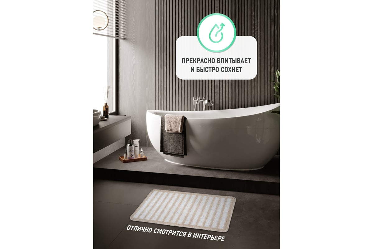 Коврик для ванной комнаты «Spiral Natural » в стильном, современном бело-бежевом дизайне, с интересным тиснением, отлично дополнит интерьер в любом популярном стиле дизайна.Удобный размер 50×80 см подойдет и для просторной ванной комнаты, и для компактного санузла, придав оформлению необходимый завершающий штрих.