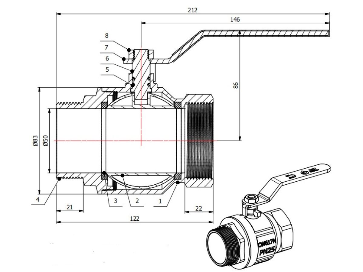 Кран шаровый 2″ с внутренней-наружной резьбой ручка PN25, AV Engineering