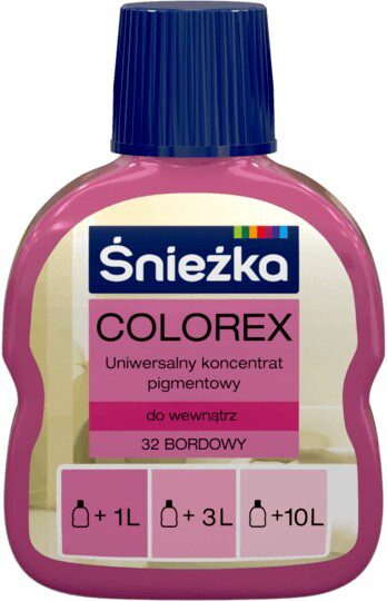 Колер SNIEZKA Colorex №32 бордовый 0,1 л – водная дисперсия пигментов с добавлением вспомогательных средств, которые также позволяют сочетать его с изделиями на основе растворителей. Концентрат предназначен для расцветки избранным цветом готовых водорастворимых красок и красок на основе растворителей: эмульсионных, масляно-фталевых, клеевых, нитроцелюлозних, хлоркаучуковых. Некоторые из имеющихся цветов можно применять вне помещений. Пигментный концентрат предназначен для расцветки эмульсионных, клеевых, масличных, фталевых, хлоркаучуковых и других красок. Добавлять в зависимости от желательного цвета, неболее чем 10% объему. Краситель с номерами 11, 12, 13, 20, 21, 22, 23, 32, 40, 41, 42, 44, 45, 50, 54 применяются только внутри помещений.