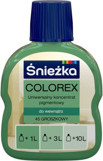 Колер SNIEZKA Colorex №45 салатовый 0,1 л – водная дисперсия пигментов с добавлением вспомогательных средств, которые также позволяют сочетать его с изделиями на основе растворителей. Концентрат предназначен для расцветки избранным цветом готовых водорастворимых красок и красок на основе растворителей: эмульсионных, масляно-фталевых, клеевых, нитроцелюлозних, хлоркаучуковых. Некоторые из имеющихся цветов можно применять вне помещений. Пигментный концентрат предназначен для расцветки эмульсионных, клеевых, масличных, фталевых, хлоркаучуковых и других красок. Добавлять в зависимости от желательного цвета, неболее чем 10% объему. Краситель с номерами 11, 12, 13, 20, 21, 22, 23, 32, 40, 41, 42, 44, 45, 50, 54 применяются только внутри помещений.