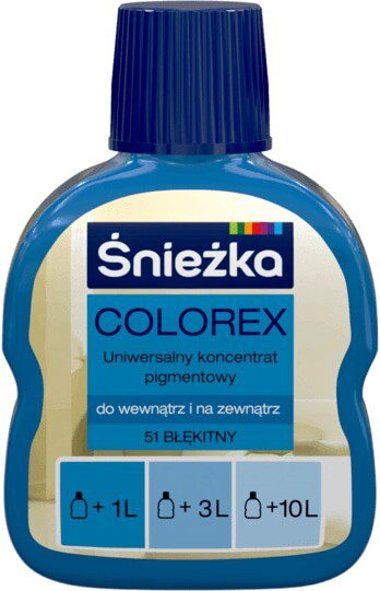 Колер SNIEZKA Colorex №51 голубой 0,1 л – водная дисперсия пигментов с добавлением вспомогательных средств, которые также позволяют сочетать его с изделиями на основе растворителей. Концентрат предназначен для расцветки избранным цветом готовых водорастворимых красок и красок на основе растворителей: эмульсионных, масляно-фталевых, клеевых, нитроцелюлозних, хлоркаучуковых. Некоторые из имеющихся цветов можно применять вне помещений. Пигментный концентрат предназначен для расцветки эмульсионных, клеевых, масличных, фталевых, хлоркаучуковых и других красок. Добавлять в зависимости от желательного цвета, неболее чем 10% объему. Краситель с номерами 11, 12, 13, 20, 21, 22, 23, 32, 40, 41, 42, 44, 45, 50, 54 применяются только внутри помещений.