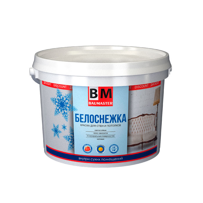 Краска “Белоснежка” для высококачественного и экономичного окрашивания стен, потолков и других поверхностей, в том числе подверженных механическому износу. Однородная матовая с повышенной белизной. Обладает хорошей адгезией к штукатурке и ранее нанесённой воднодисперсионной краске. Паропроницаемая. Не обладает стойкостью к мытью. Не рассчитана на постоянное увлажнение. Рекомендуется для внутренних работ.