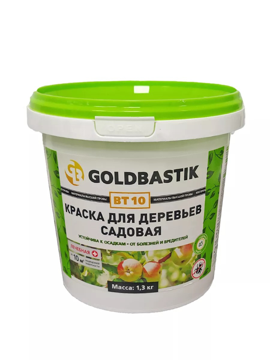 Краска BТ для деревьев GOLDBASTIK 1,3 кг (BТ 10) это биотехническое средство для лечебно-профилактической окраски и дезинфекции ствола, ветвей плодовых и декоративных деревьев и кустарников в целях защиты и лечения от возбудителей болезней; защищает кору от резких перепадов температур; препятствует развитию мхов и лишайников; защищает от зимующих насекомых-вредителей; способствует заживлению ран, используется для замазывания распилов.