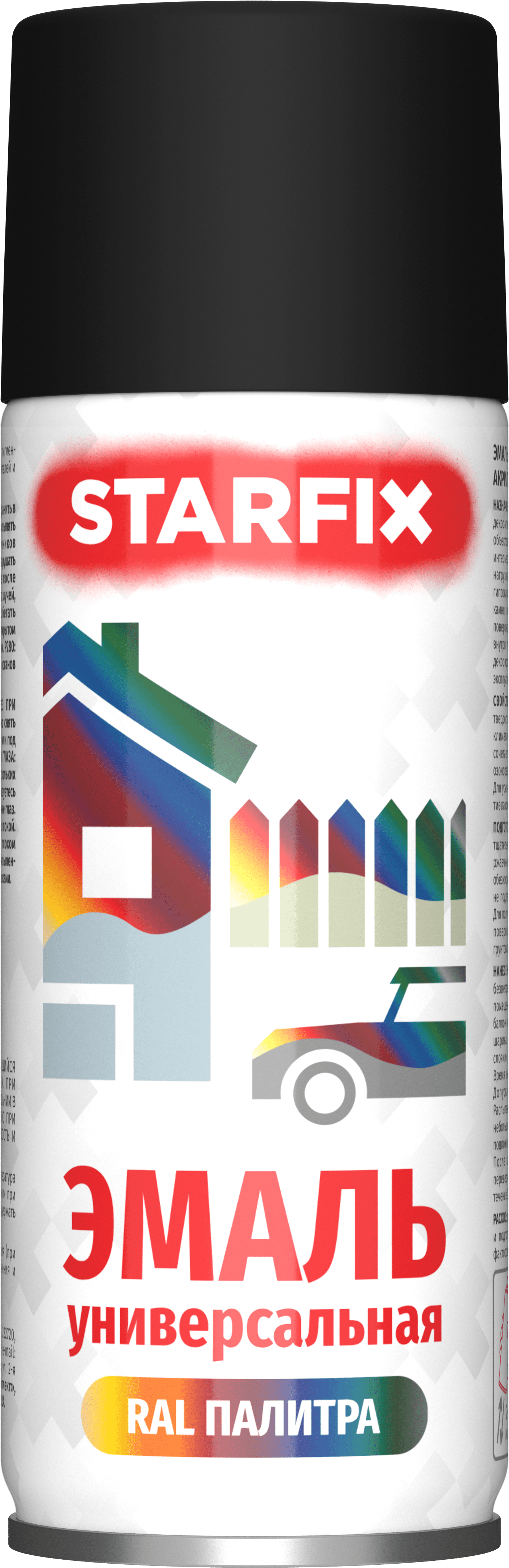 Краска-эмаль аэрозольная универсальная черный матовый 9011 STARFIX 520 мл (SM-103039-1) применяется для быстрого и равномерного окрашивания, декоративного оформления и ремонта небольших по размеру объектов и бытовых изделий, элементов ландшафтного, интерьерного дизайна, не подвергающихся механическим нагрузкам. Рекомендуется нанесение по плотным минеральным поверхностям: бетонным, кирпичным, оштукатуренным, гипсокартонным, из искусственного и натурального камня, неглазурированной керамики, щебня; по металлическим поверхностям, в т. ч. окрашенным ранее порошковыми красками (наружные стенки холодильников, стиральных машин, микроволновых печей и т.п.), по натуральным плотным тканям (плакаты, элементы одежды), эксплуатирующимся в атмосферных условиях и внутри помещений. Возможно применение для окраски и декорирования изделий из древесины (элементы мебели, рамки для фото, окна, двери, и др., кроме полов) и стекла, эксплуатирующихся внутри помещений.