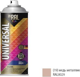 Эмаль аэрозольная универсальная INRAL Universal Enamel стойкая к воздействию атмосферных факторов. Отлично соединяется с основанием. Быстро сохнет. Рекомендуется для декоративной покраски различных поверхностей из металла, дерева, пластмассы, гипса, штукатурки. Служит для покраски жестяных кузовов, велосипедов, мебели. Не содержит соединений свинца, хрома и веществ, разрушающих озоновый слой. Используется для внутренних и наружных работ. Время высыхания при 20 °С около 20 минут. Теоретический расход 400 мл на 2,0 кв. м. Рекомендуется наносить 2 -3 слоя. В основе – алкидные сополимеры.