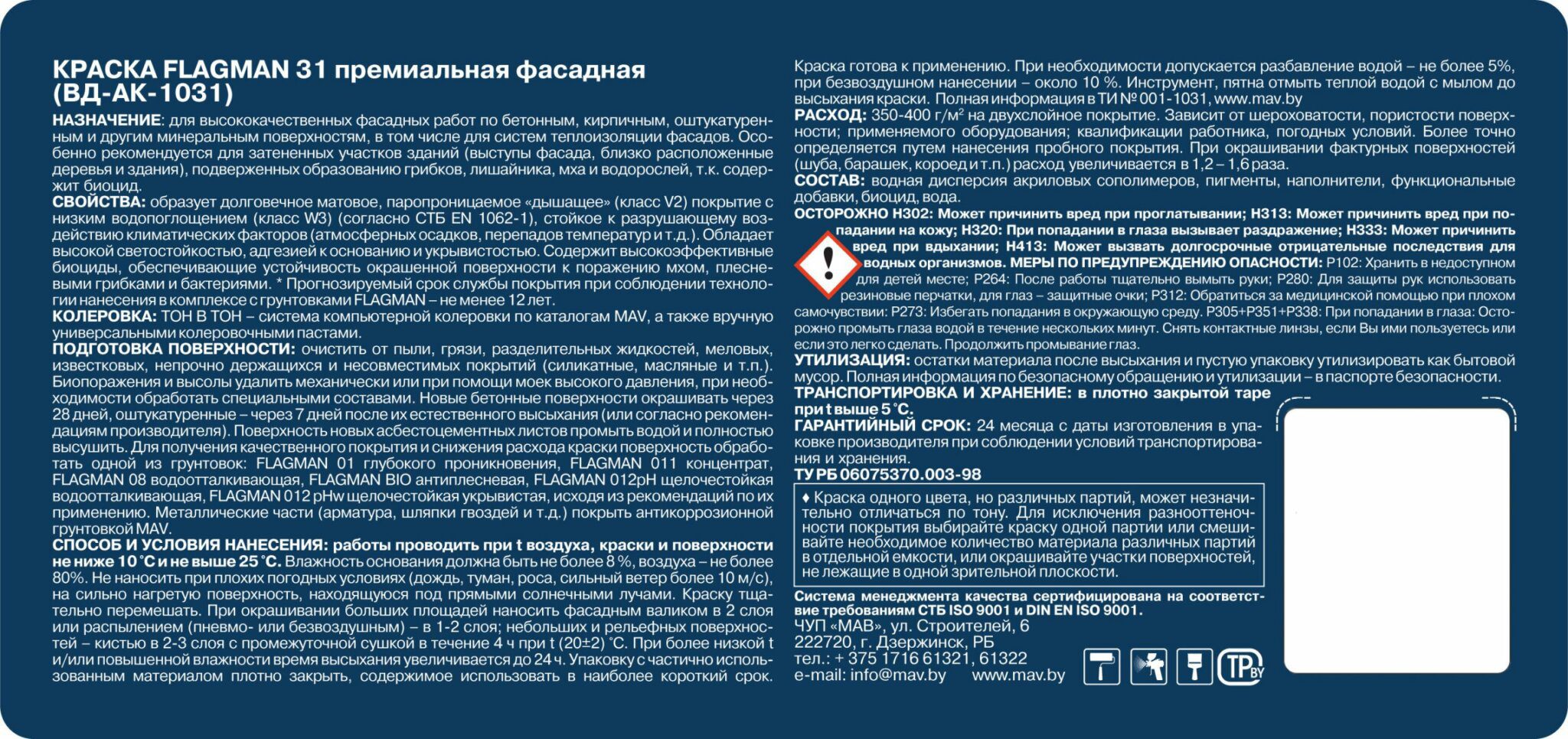 Состав Водная дисперсия акриловых сополимеров, пигменты, наполнители, функциональные добавки, биоцид, вода.
