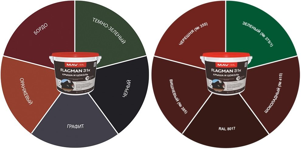 Краска ВД акриловая FLAGMAN 31к крыша и цоколь для декоративно-защитной окраски асбестоцементных листов (шифера), цементно-песчаной черепицы, а также бетонных, кирпичных, оштукатуренных цоколей зданий и других ответственных поверхностей с повышенным воздействием атмосферных факторов; содержит биоцид (альгицид-фунгицид), обеспечивающий защиту против роста грибков, мха и водорослей.