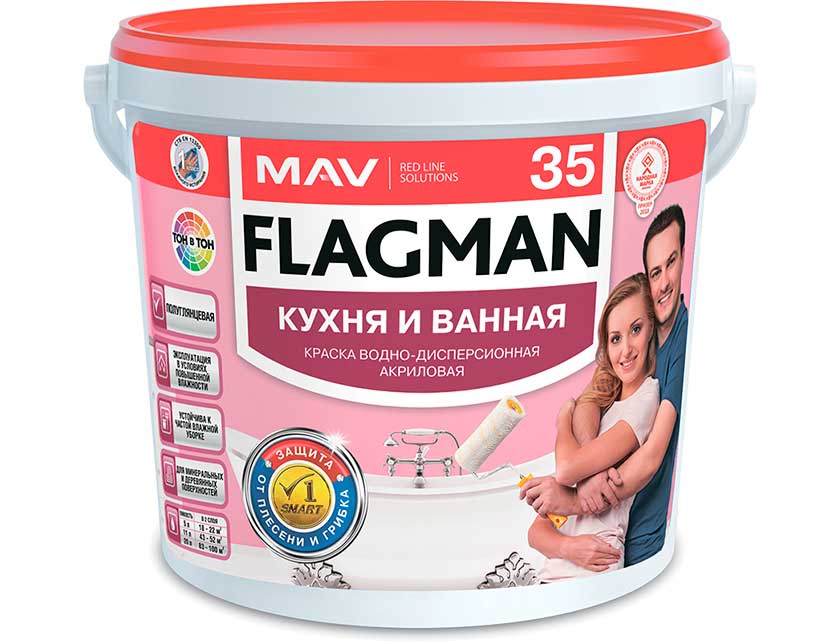 Краска ВД FLAGMAN 35 кухня и ванная база TR 1 л для окраски стен и потолков внутри помещений с повышенной влажностью (ванные комнаты, бассейны, санузлы, прачечные, подвалы), а также с нормальной влажностью, нуждающихся в регулярной влажной уборке и дезинфекции (кухни, туалеты, детские комнаты, помещения учебных и медицинских учреждений, столовые, кафе, бытовые помещения). Окрашиваемые поверхности: минеральные (бетонные, кирпичные, оштукатуренные, зашпатлеванные, гипсокартонные), деревянные (в т.ч. ДСП, ДВП, MDF и др., кроме окон и дверей).